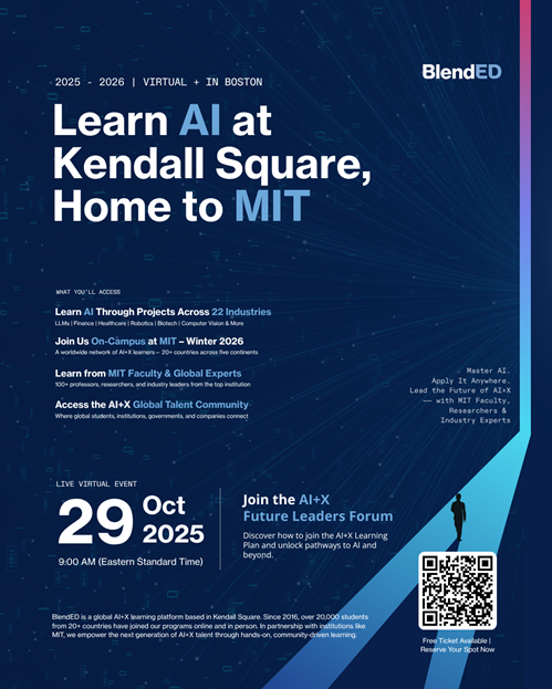 The AI+X Program, led by BlendED in collaboration with MIT faculty and researchers, invites students from NCKU to join an online open house information session introducing the 2026 AI+X Program.